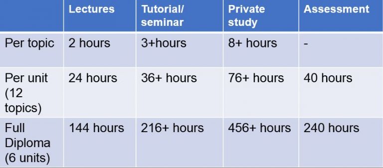 Each unit is made up of 12 topics delivered via lectures, tutorial and/or seminars, and private study. All units are assessed by assignment only. The hours of study are: