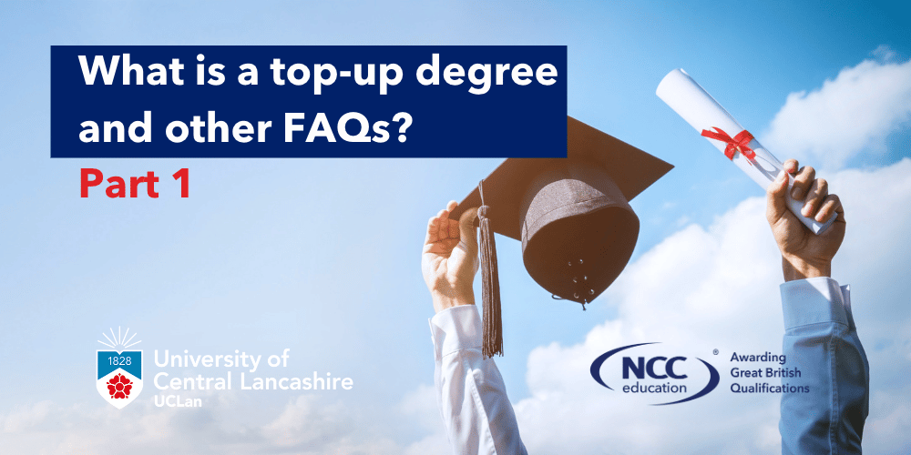A top-up degree is a one-year full-time or two-year part-time degree programme equivalent to the final year of an honours degree, allowing you to build on your previous qualifications. NCC Education offer two distance learning top-ups degrees in partnership with the University of Central Lancashire (UCLan).